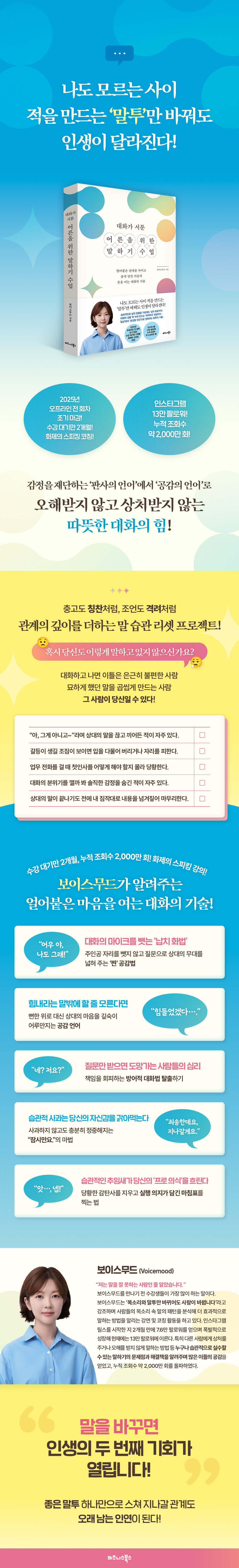 이 책은 폭발적으로 인기를 끌었던 보이스무드의 콘텐츠 중 가장 실용적이고 사람들에게 화제가 되었던 대화의 기술을 골라 담았다. ‘대화가 서툰 어른’을 위해서 ‘인생의 태도’를 변화시키는 대화의 기술을 알려준다. 누구나 실수할 수 있는 내 말하기의 문제점과 해결책을 되짚어 보며 관계를 돌보는 것은 물론 일터에서도 원활한 소통을 이룰 수 있도록 돕는다. 다양한 사례와 예시를 통해 다정하지만 흐릿하지 않고, 부드럽지만 중심이 있는 말하기의 힘을 배울 수 있을 것이다.