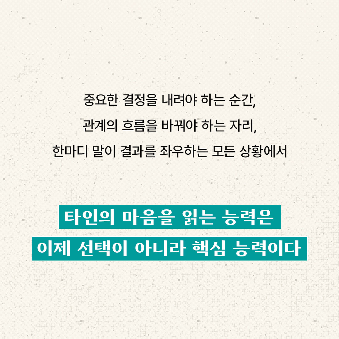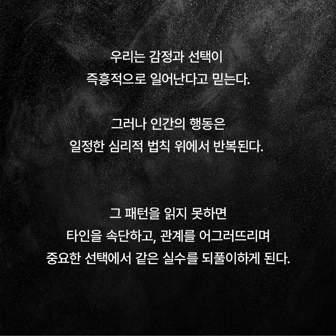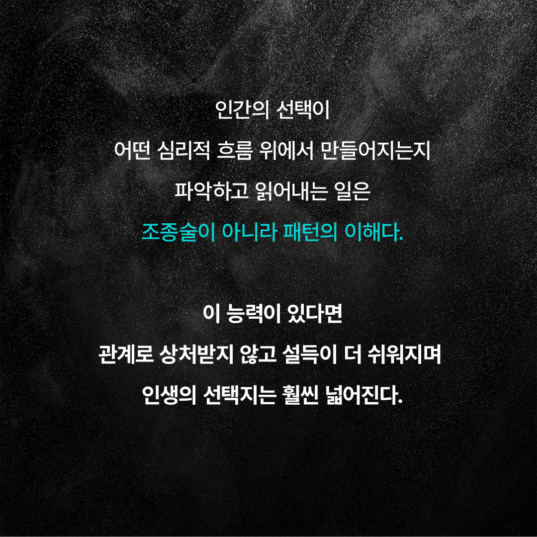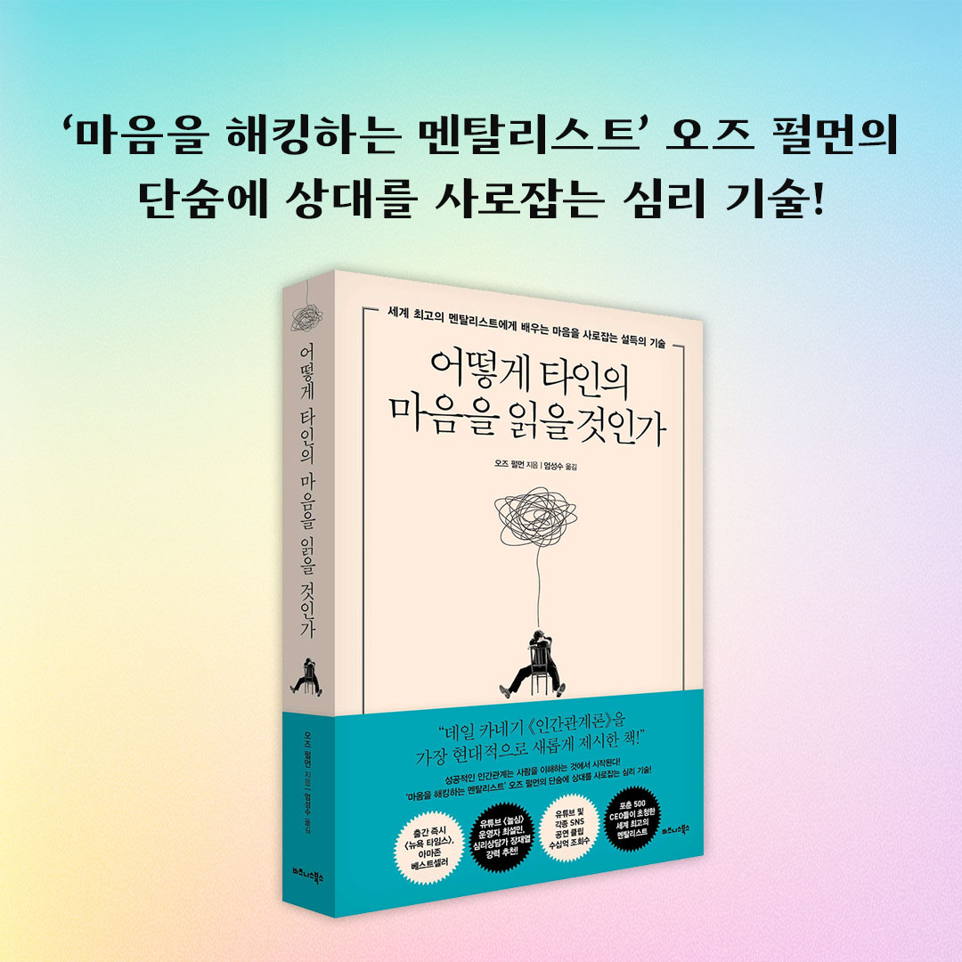 다만 여기서 그가 말하는 ‘마음 읽기’는 단순히 무대 위 초능력이 아니다. 상대의 생각을 꿰뚫는 신비한 능력도, 심리를 조종하는 교묘한 술수는 더더욱 아니다. 그저 인간의 선택이 어떤 심리적 흐름 위에서 만들어지는지 파악하고 읽어내는 일이다. 그렇게 타인의 행동 패턴을 읽게 되면 우리는 스스로의 선택을 더 분명하게 만들고, 관계를 더 유리한 방향으로 이끌 수 있다.