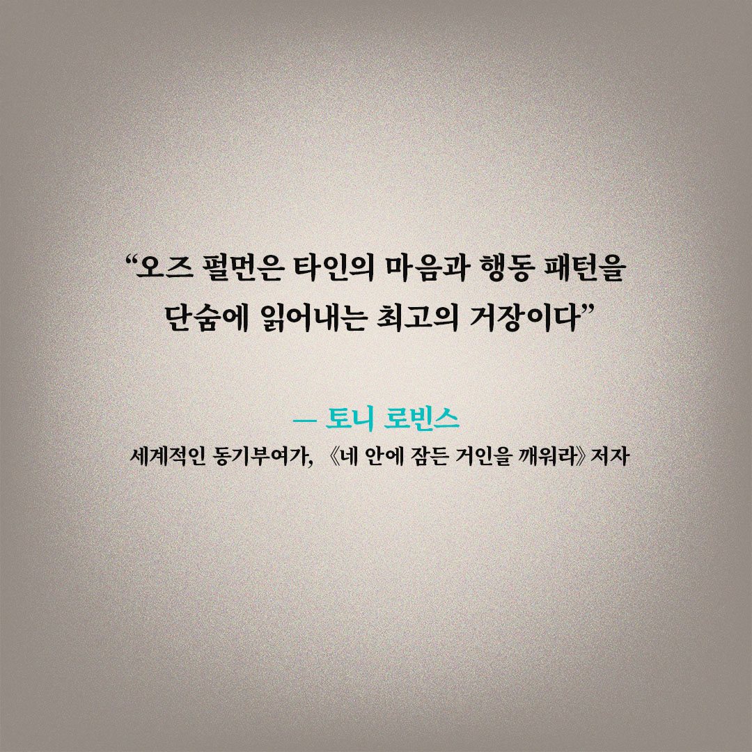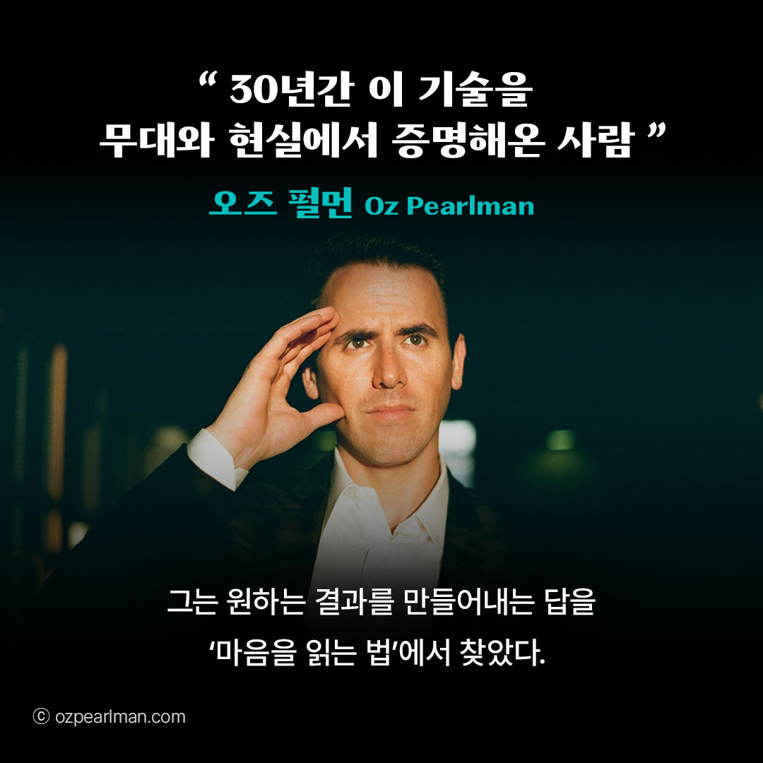 세계 최고의 멘탈리스트 오즈 펄먼(Oz Pearlman)은 그 답을 ‘마음을 읽는 법’에서 찾았다. 〈아메리카 갓 탤런트〉 시즌 10에서 최종 3위에 오르며 대중적 인지도를 얻은 그는 무대를 넘어 비즈니스 현장까지 영역을 확장했다. 리처드 브랜슨(Richard Branson)과 토니 로빈스(Tony Robbins) 같은 세계적인 기업가·동기부여가들과 어깨를 나란히 하며 애플·구글·아마존 등 《포춘》 500대 기업과 버락 오바마, 빌 클린턴, 스티븐 스필버그 같은 거물들의 극찬 속에 마음을 읽는 심리 기법을 입증했다.