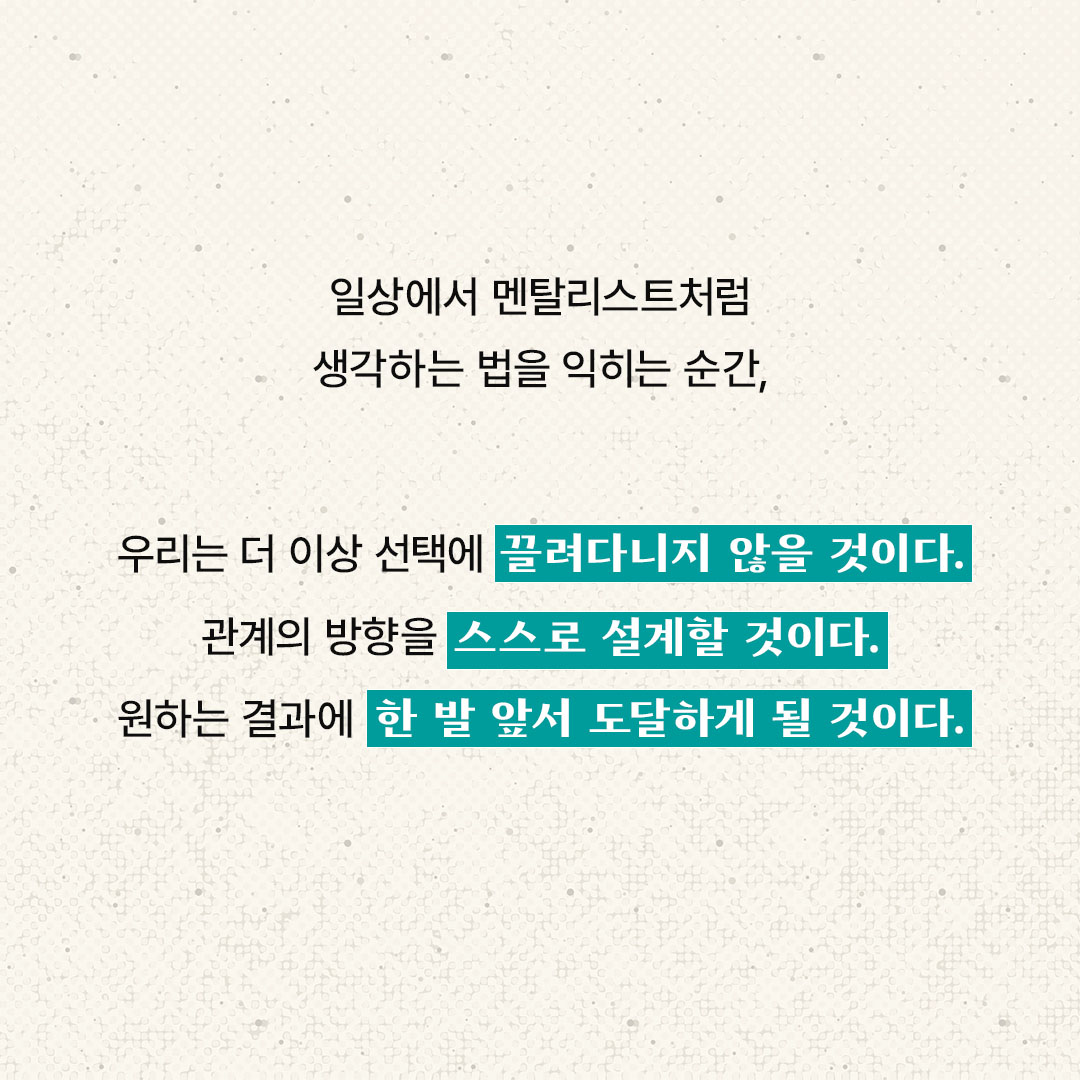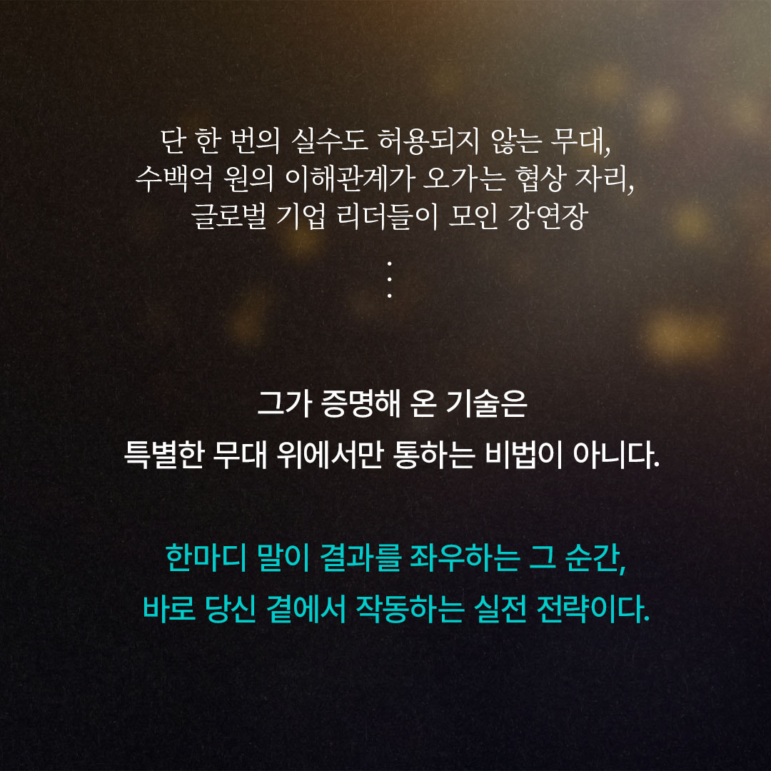 지난 30년간 수천 번의 공연과 수많은 비즈니스 현장에서 그는 멘탈리즘을 단순한 트릭이 아닌 마음을 움직이게 하는 기술로 진화시켰다. 우연처럼 보이는 결정 역시 일정한 심리적 패턴 위에서 만들어진다는 사실을 밝혀냈으며, 이를 이해하고 활용해야 선택의 흐름 또한 달라진다는 것도 깨달았다. 타인의 마음을 읽는 능력은 불필요한 오해와 갈등을 줄이고 원하는 결과에 더 수월하게 도달하도록 돕는 것이다.