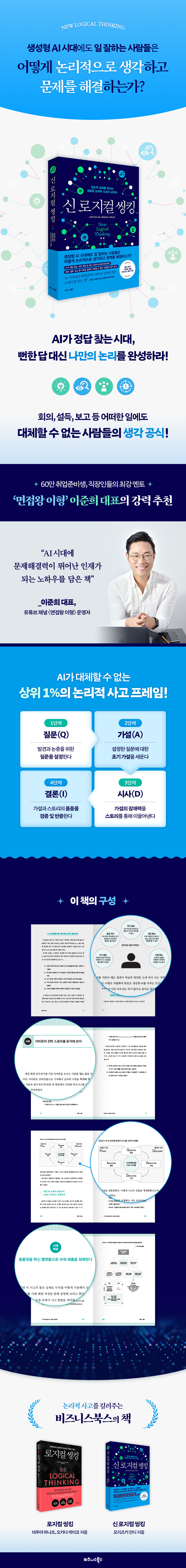 신 로지컬 씽킹에는 타고난 재능이 필요 없다. ‘여전히 논리가 부족하다’는 사람부터 ‘논리적이만 평범하고 설득력이 약하다’는 사람까지, 이 책 한 권이면 논리적 사고의 기본기를 다지고 창의적 사고를 겸비해 AI 시대에 살아남는 인재가 될 수 있을 것이다.